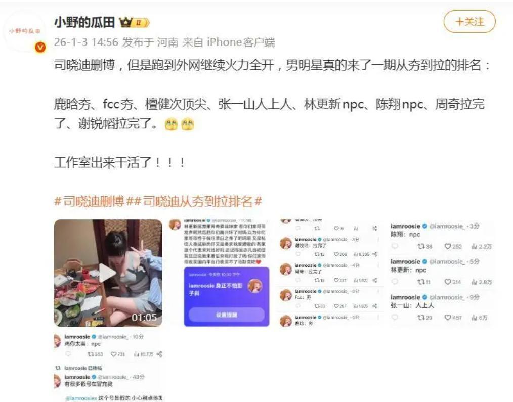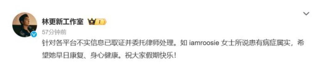 林更新工作室的回应也挺有意思,既说了已经取证并委托律师处理不实信息,还顺带提了一嘴,要是司晓迪(iamroosie女士)真的有病,希望她能早日康复、身心健康,最后还祝大家假期快乐,这暗戳戳的内涵,网友们都看出来了,纷纷调侃“这是在说她有病吧”。