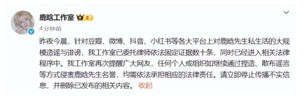 这一波密集爆料下来,直接引发了内娱震动,网友们都炸开了锅,纷纷讨论这事的真假。 不过爆料刚出来没多久,多位明星工作室就火速下场辟谣,态度都相当明确。鹿晗工作室直接发声明,说各大平台上关于鹿晗私生活的那些说法都是造谣诽谤,已经委托律师固定了几十条证据,而且已经启动了法律程序。还特意提醒网友,要是再继续散布不实信息,就得依法承担责任,赶紧删除相关内容。